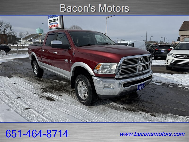 2012 RAM 2500 Laramie — Deep Molten Red Pearl Coat/Bright Silver Metallic Clear Coat exterior with Dark Slate Gray leather interior. Powered by the Cummins 6.7L Turbo Diesel I6 delivering 350 hp and 650 lb-ft of torque, this one-owner truck has excellent overall condition and well-maintained, low mileage (under 99,000 miles — averaging less than 7,000 miles per year). Asking price is listed below J.D. Power Book value. Clean CARFAX.