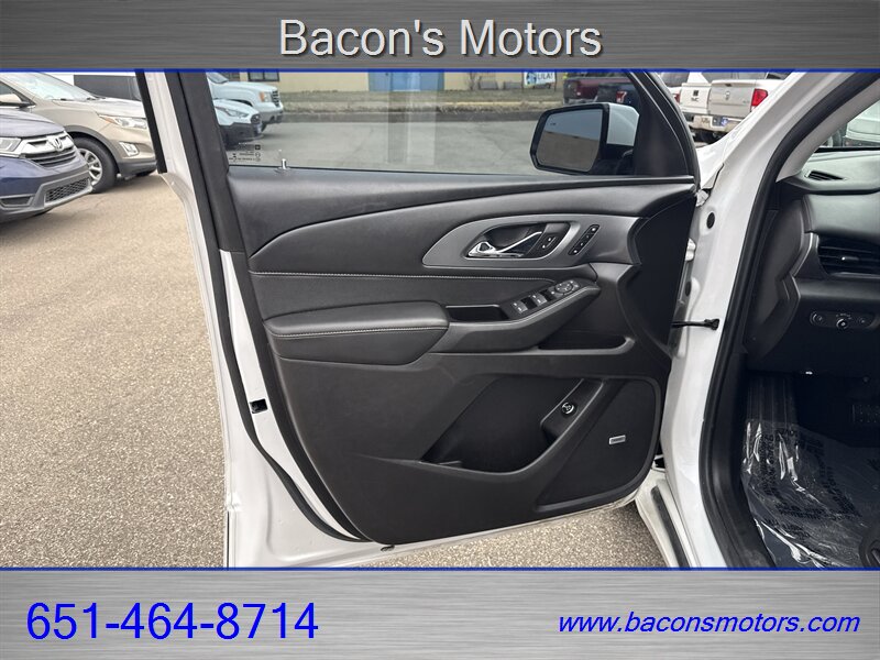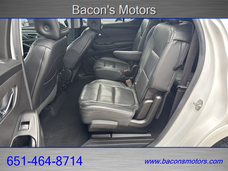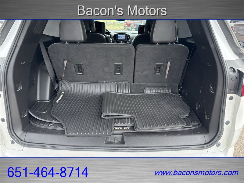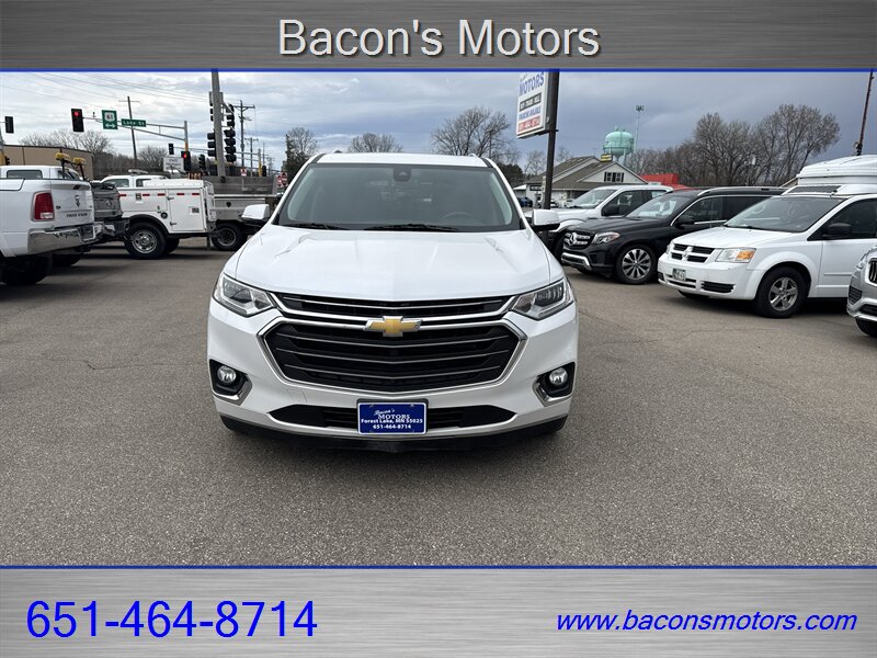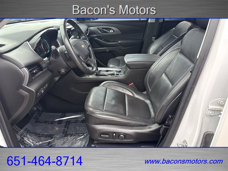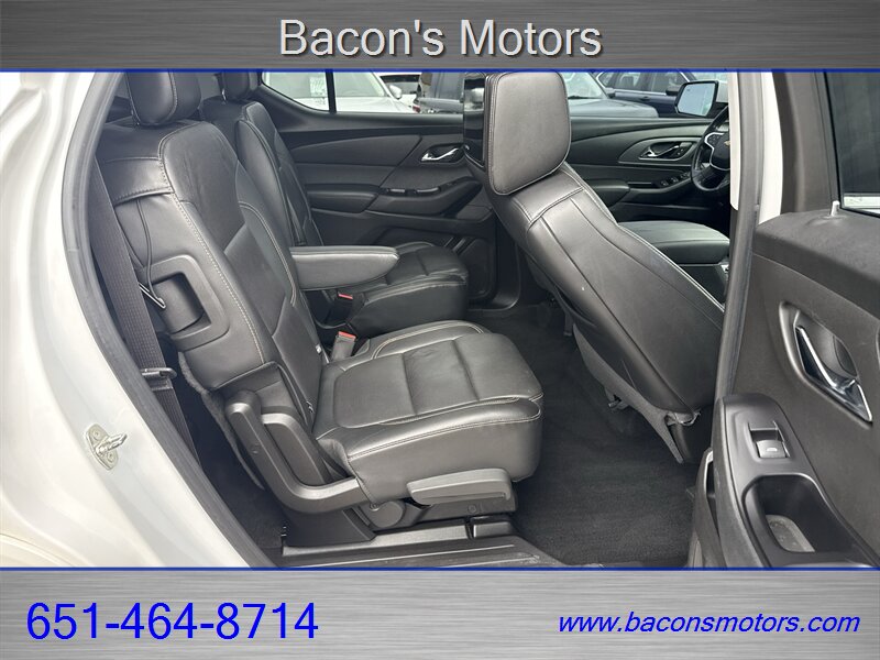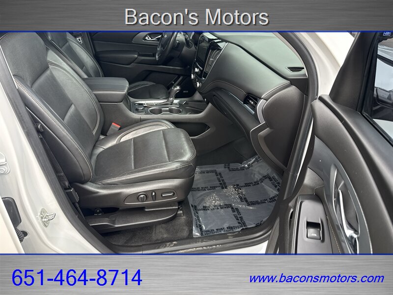 2018 Chevrolet Traverse Premier — Summit White exterior, Jet Black leather interior. This three-row crossover is powered by Chevrolet’s 3.6L V6 rated at 310 hp and 266 lb-ft of torque, paired with a 9-speed automatic transmission. It delivers an EPA-estimated 17 MPG city and 25 MPG highway. Seating is configured to accommodate up to seven or eight passengers depending on the second-row layout, and the third row folds flat for expanded cargo capacity.