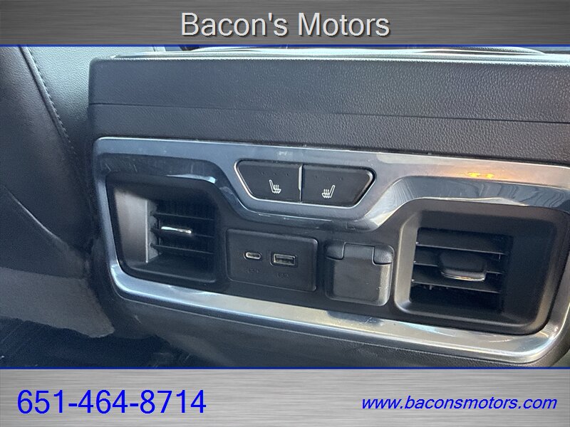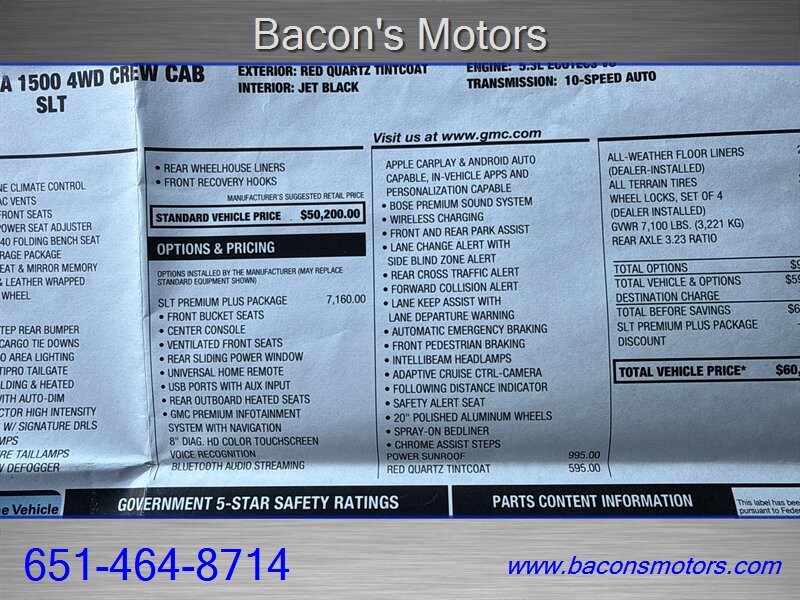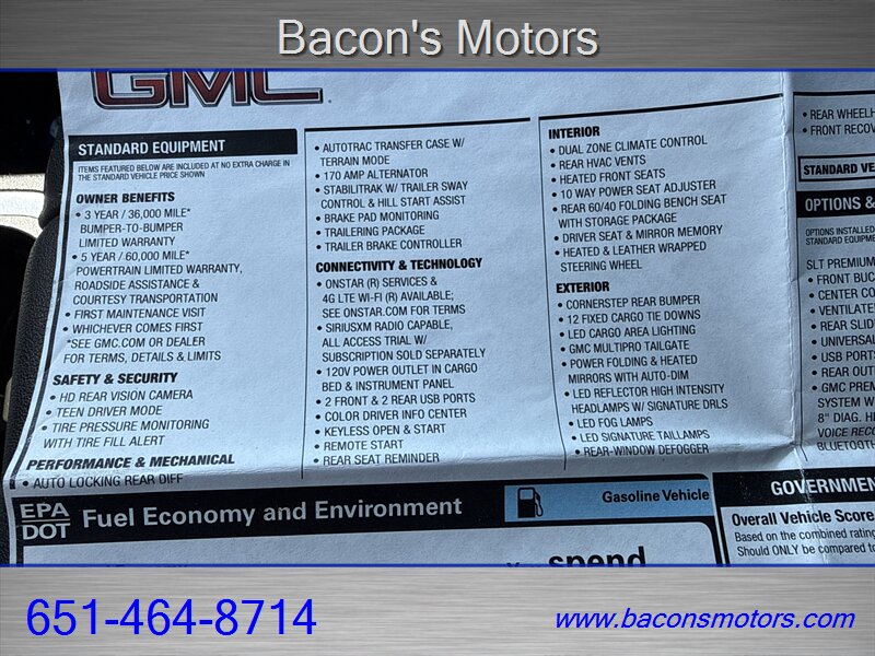 - SLT Premium Plus PackageIncludes GMC Infotainment System w/ navigation and 8 in. diagonal color touch-screen, Bose premium sound system (includes 7 speakers w/ subwoofer), wireless charging, heated and ventilated front bucket seats w/ center console, rear heated seats, universal home remote, 2 USB ports w/ auxiliary input, front and rear park assist, lane keep assist w/ lane departure warning, forward collision alert, automatic emergency braking, front pedestrian braking, following distance indicator, safety alert seat, adaptive cruise control, IntelliBeam automatic high beam headlamps, rear sliding power window, 20 in. x 9 in. polished aluminum wheels, chrome assist steps, spray-on bedliner, and perimeter lighting.