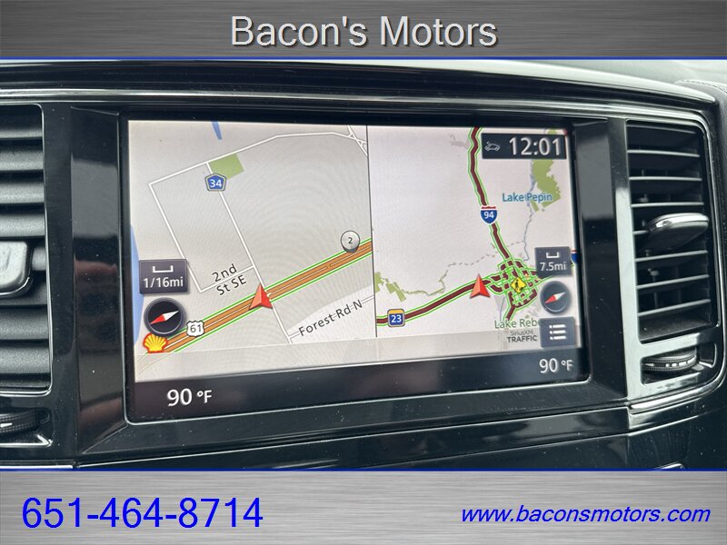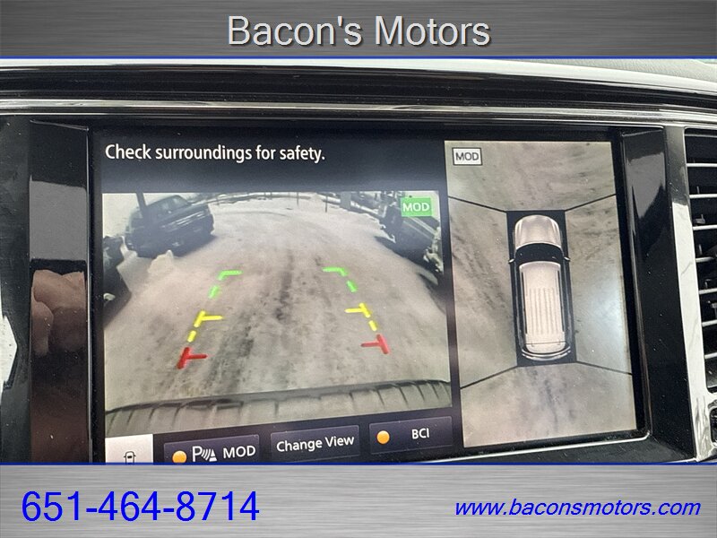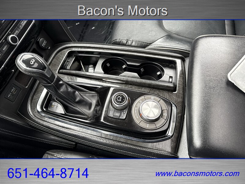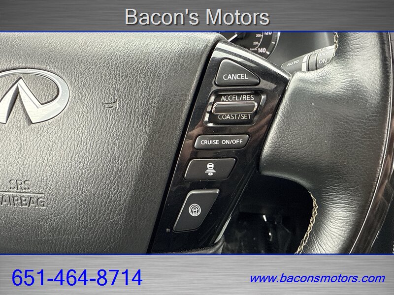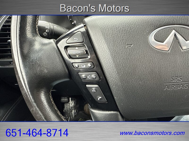 - INFINITI infotainment and connectivity suite with touchscreen display, smartphone integration and multiple USB/Aux inputs for media and device charging, plus Bluetooth hands-free calling and audio streaming.