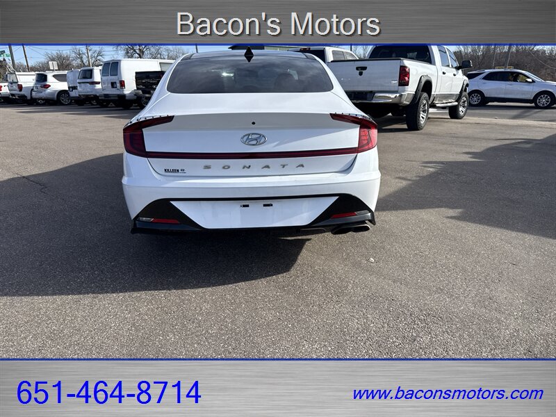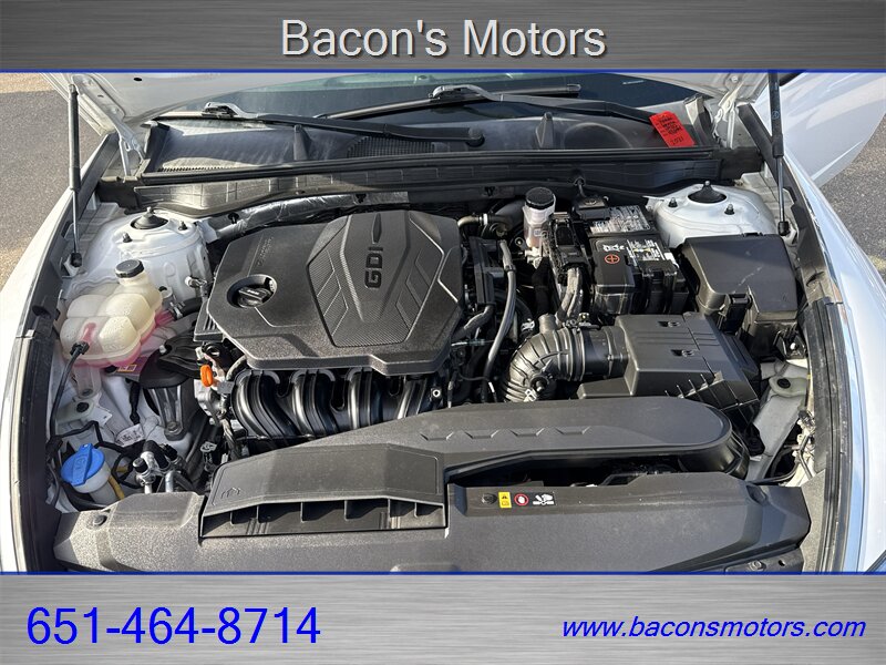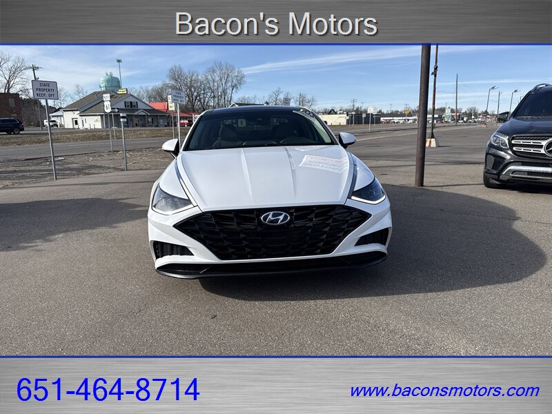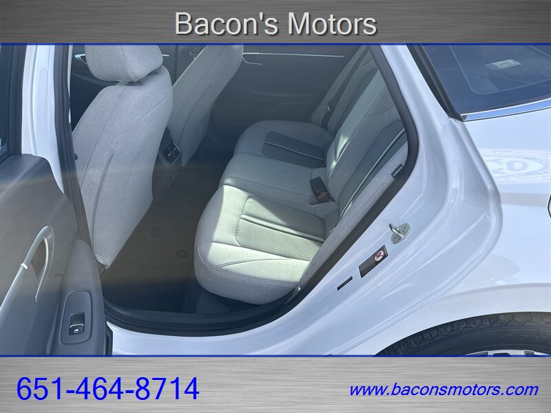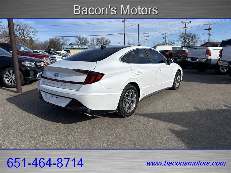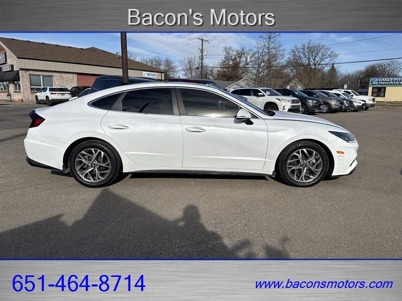 2021 Hyundai Sonata SEL — Quartz White exterior, Black cloth interior. This Sonata is powered by the factory 2.5L I4 SULEV engine (191 hp, 181 lb-ft) paired with an 8-speed automatic transmission and front-wheel drive. EPA fuel economy is an efficient 27 MPG city / 37 MPG highway.